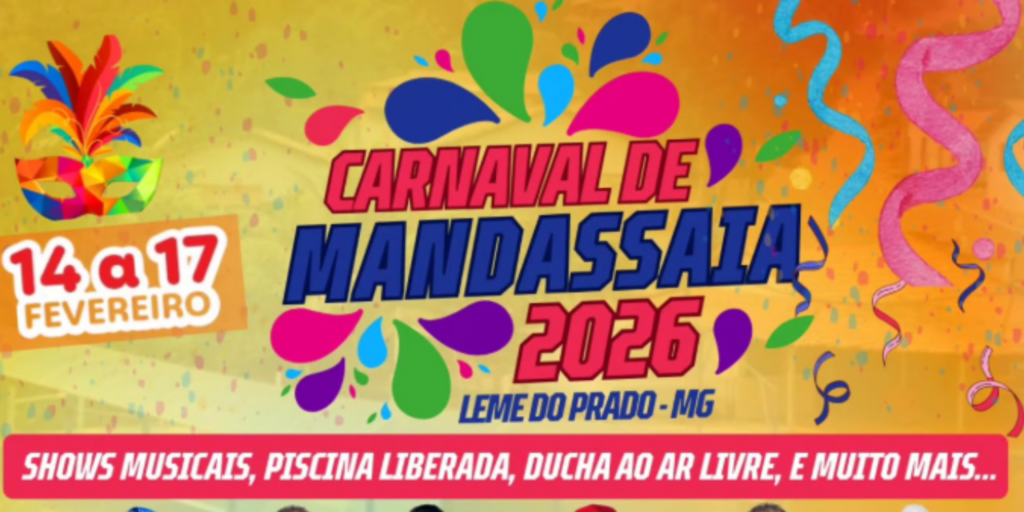 O Carnaval de Mandassaia 2026, em Leme do Prado (MG), acontecerá de 14 a 17 de fevereiro, reunindo música, lazer e atividades para toda a família. O evento contará com shows musicais, piscina liberada, ducha ao ar livre e diversas opções de entretenimento.
