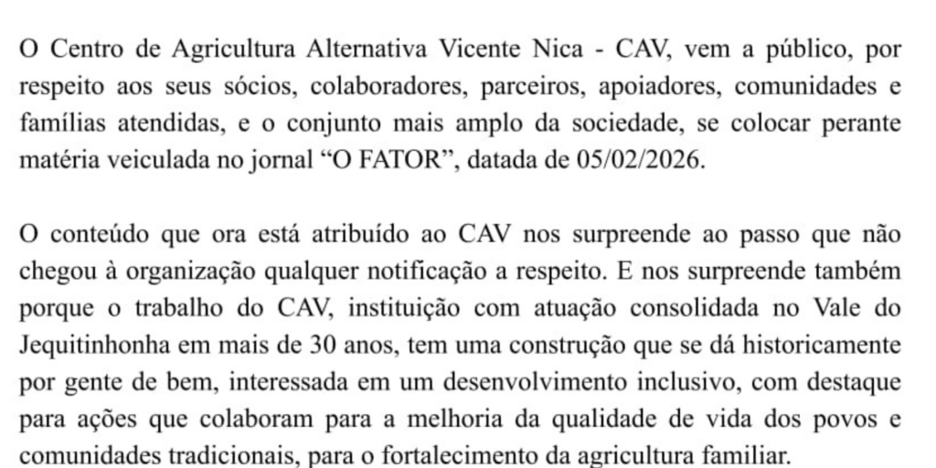 Na nota, o CAV afirma que foi surpreendido pelo conteúdo divulgado e que não recebeu qualquer notificação prévia sobre as irregularidades atribuídas à instituição. A organização destaca que possui mais de 30 anos de atuação no Vale do Jequitinhonha, com trabalho voltado ao fortalecimento da agricultura familiar, ao apoio às comunidades tradicionais e à promoção do desenvolvimento inclusivo.