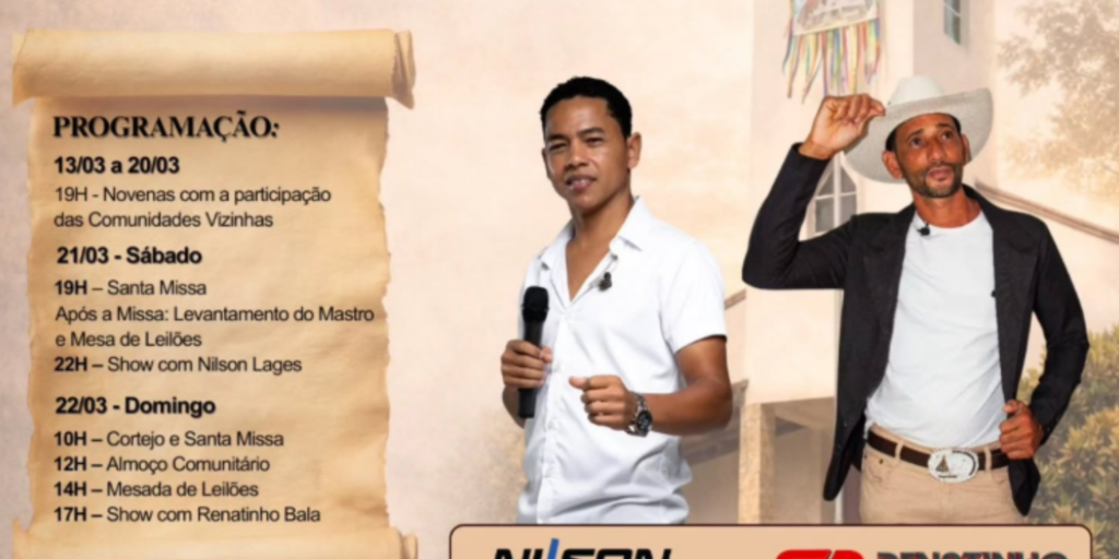 No sábado, dia 21 de março, está prevista a Santa Missa às 19h. Após a celebração, será realizado o tradicional levantamento do mastro, seguido de mesa de leilões e, às 22h, show musical com Nilson Lages, prometendo animar o público presente.