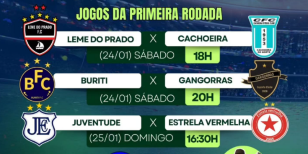 Na abertura, o confronto será entre Leme do Prado e Cachoeira, às 18h, seguido pelo duelo entre Buriti e Gangorras, marcado para as 20h. No domingo, 25 de janeiro, o Campeonato terá o jogo entre Juventude e Estrela Vermelha, às 16h30, dando continuidade à primeira rodada.
